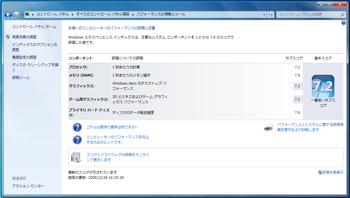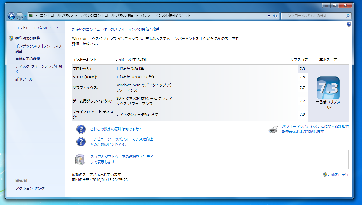 ■Windows 7の「エクスペリエンスインデックス」表示画面